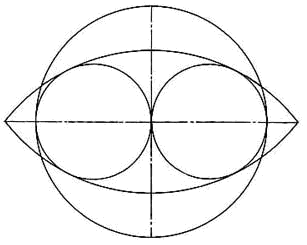 4. We next draw tangential arcs from the top and bottom points as centers, creating a vesica, which is also expressed when two circles each touch another at the center, like this (at 90 degrees):
